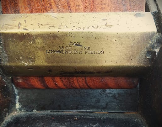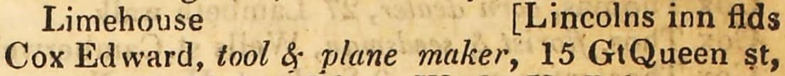 Edward Cox, Tool & Plane Maker, 1 Great Queen St. Lincoln’s Inn Fields, 1843 Robson’s London City Directory.