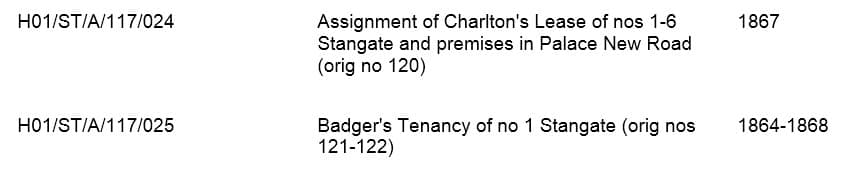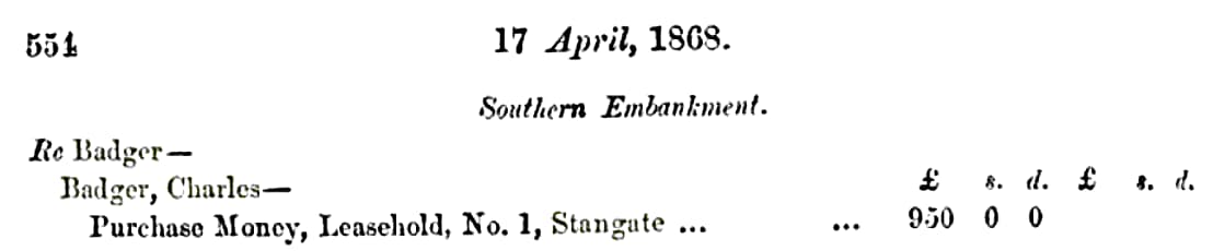 Charles Badger, 1 Stangate St., in the Saint Thomas Hospital Archives. Inclusion of Charles Badger at 1 Stangate St. circa 1864-1868, in the Saint Thomas Hospital Archives would give further indication that Charles Badger was compelled to relocate. The former Stangate Street numbers given do not align with any of the maps I have seen, and make no sense to me. Unless they were former Palace Road numbers?