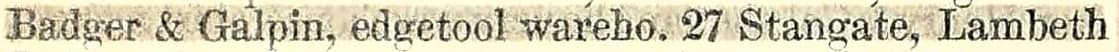 Badger & Galpin, “Edgetool Warehouswe,” 1 Stangate Street, Lambeth. 1854 London Post Office Directory. Badger & Galpin moved their shop to 1 Stangate St., sometime before the 1854 London P.O. Directory (“Badger & Galpin Edgetool Warehouse”) was published.