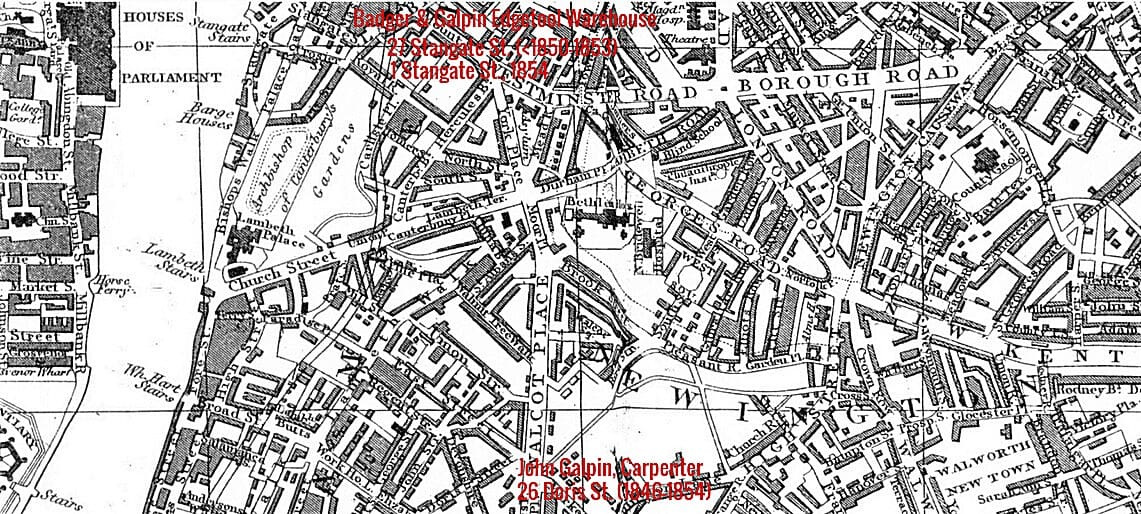 Badger & Galpin, Watkins Commercial & General London Directory Map (1852). 27 Stangate St., and 26 Doris St.