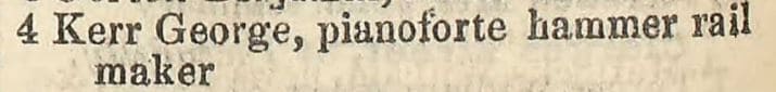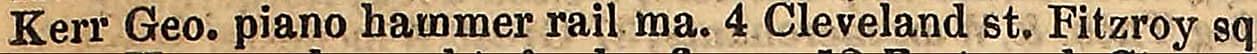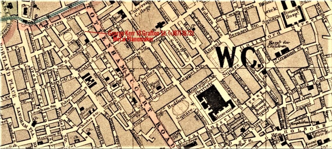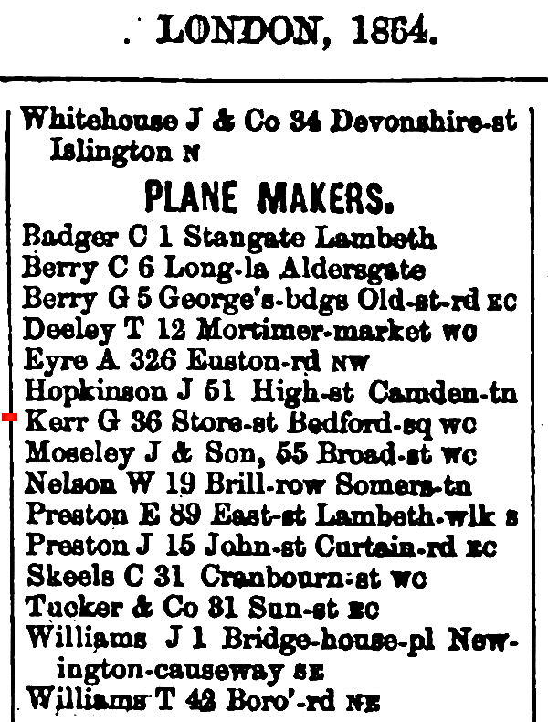 Williams London Trade Directory 1864. With this directory, a firm working location, date, and given name for George Kerr, planemaker has been established. But Kerr was on the move, almost always living at a different residence each time his location was captured: 1831 Francis St.; 1841 Neat House Row; 1845 Hindon St. (Wilton Rd. post 1912); 1850 4 Cleveland St. Fitzroy Square; 1851 to 1861 24 Buckingham Place, Fitzroy Square; 1862 No. 1 Newman Mews Oxford St.; 1863-1865 36 Store St.; 1871-72 13 Grafton St.
