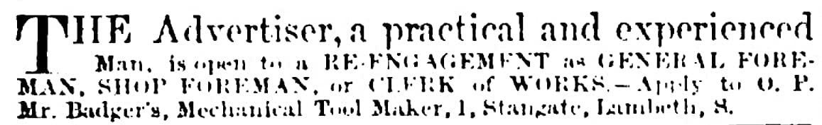 Charles Badger’s advertisement in “The Advertiser,” on 12 March, 1859, searching for a “Foreman” or “Clerk of Works” for the Badger Mechanical Tool Maker. Badger was keen on expanding his business, and clues around this, were his search for a shop foreman, as well as his proprietary description as an “Edgetool Warehouse,” or later, as a “Tool Dealer.” This ad clearly showed that Badger was running a working shop. This ad also ran in The Engineer, on 2 July 1858.