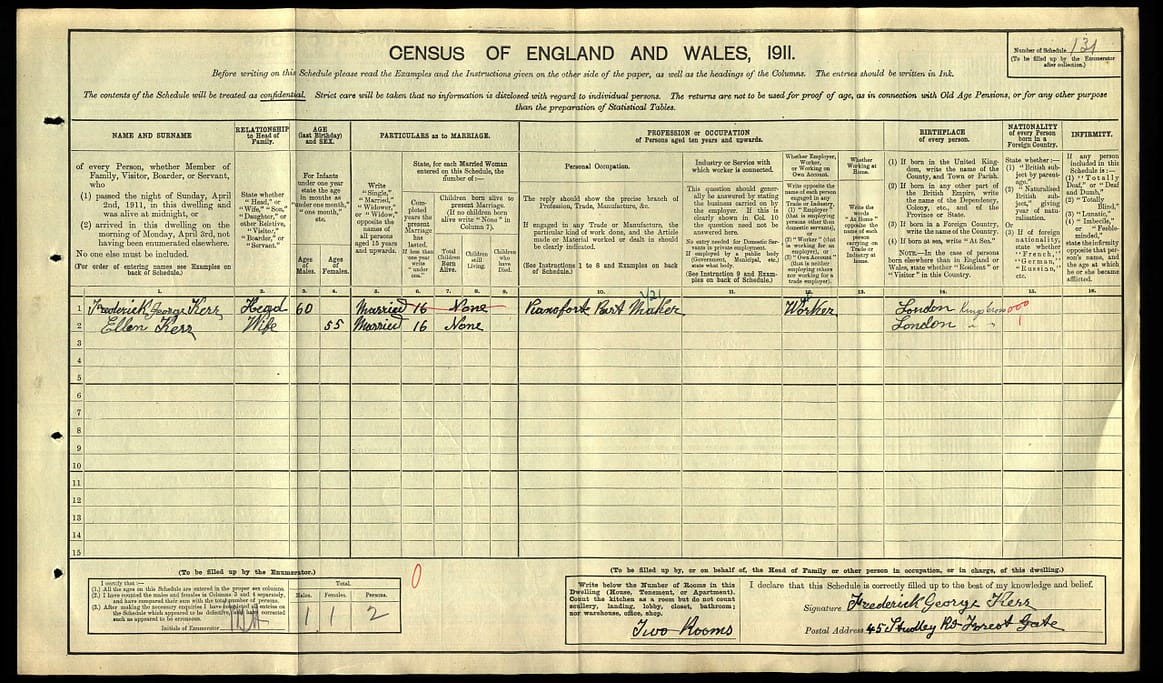 In 1911, Frederick George Kerr was living a modest life, working as a Piano Parts Maker, renting a small two room flat, with his second wife, and no children. He lived at 45 Studley Road, West Ham, Essex. Frederick assumed the job his father had earlier: as a Pianomaker. Frederick continued to work as a Pianomaker for the rest of his life, and passed away in West Ham, Essex, East London, in the fall of 1921.