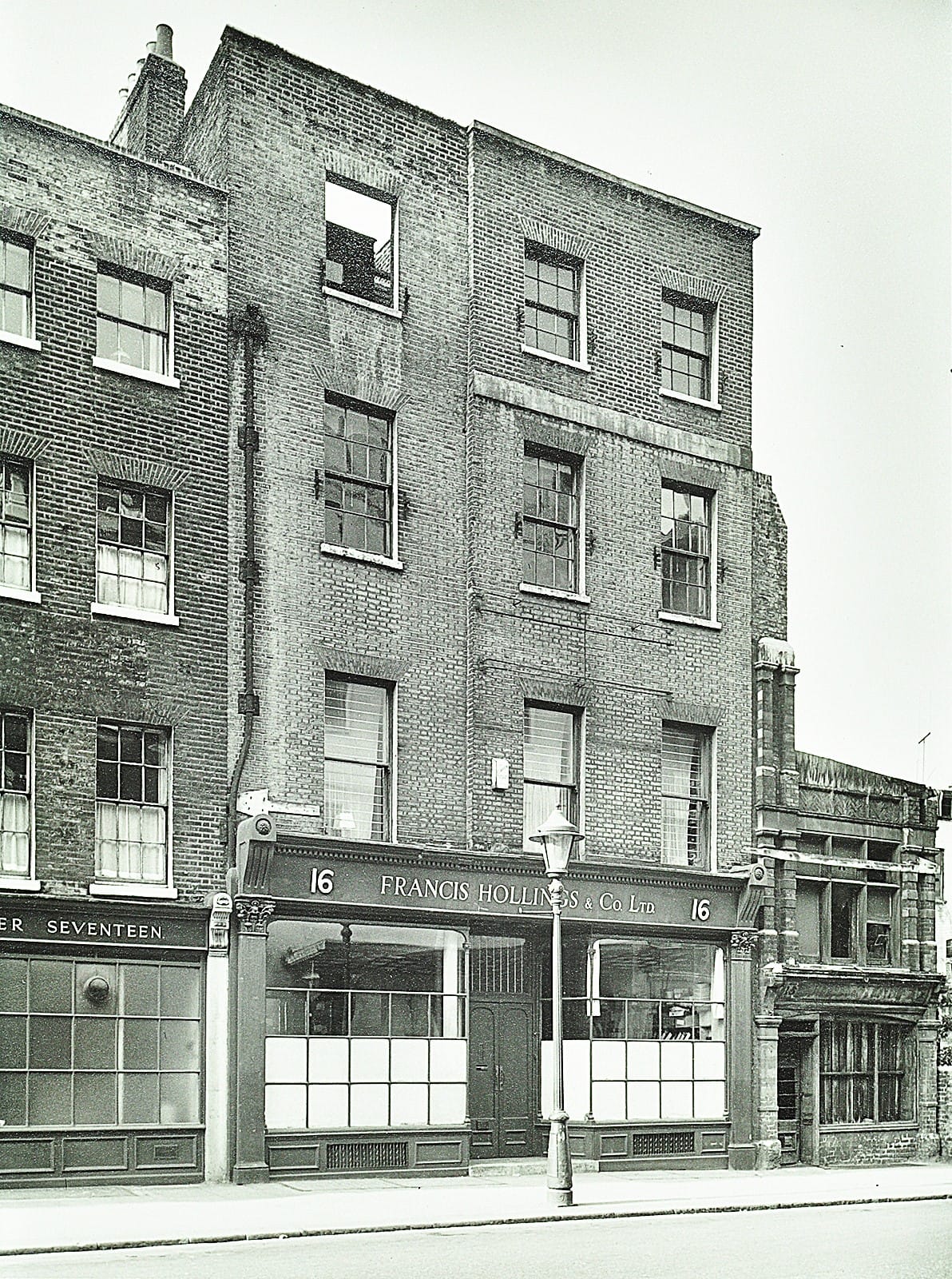 Great Queen St., in 1956,, nos. 17 London Rotary Club; 16 Francis Hollings & Co. Ltd.; 15 Edward Cox Lathe and Planemakers 1842-1854. No 15 had been vacant since c.1917.
