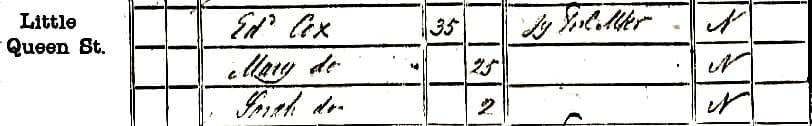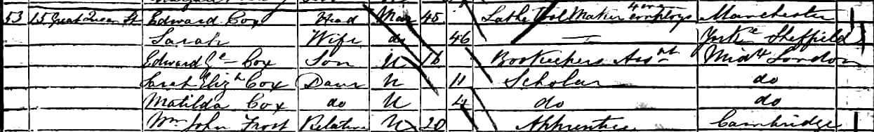 Edward Cox and his family, 1851 U.K. census. 15 Great Queen St. He declared himself a “Lathe Tool Maker; [who] employs four men.”