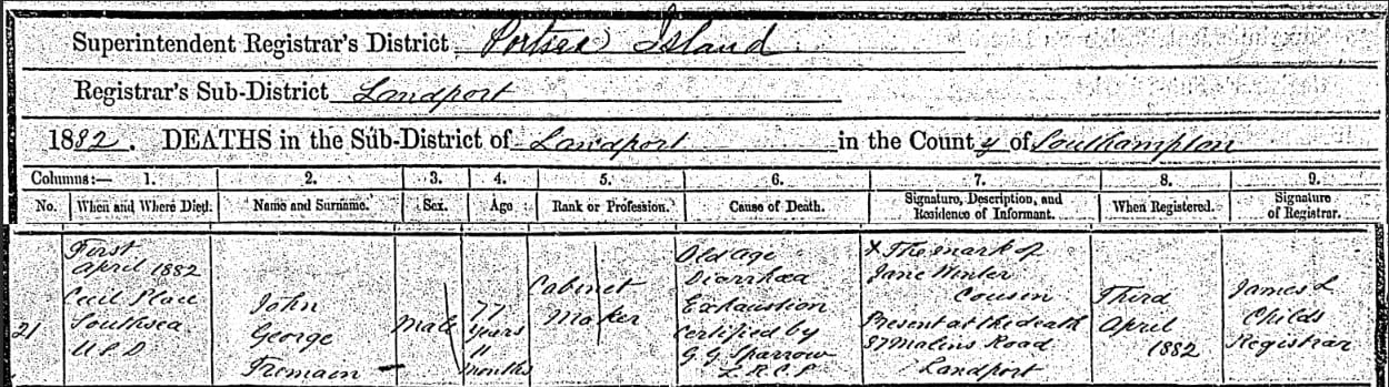 John Tremain reported himself as a “Pensioner of Collard & Collard, Pianoforte Makers, living at 55 Albert St., Portsea Island. 1881 U.K. Census. Shortly before the time of the 1881 U.K. census, John George and Sarah moved to Portsea Island, close to their respective birthplaces, Hants, Portsea, and Arundel, Sussex. In order to be eligible as a pensioner, John George Tremain must have worked a long time for Collard & Collard–most likely he worked there for his entire stay in London, 1851 to 1880.