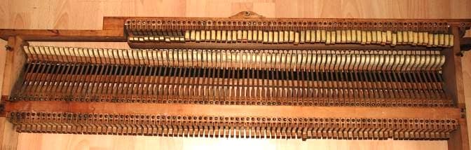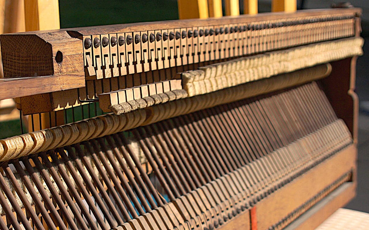 Overdamper action removed from British Victorian upright piano, revealing main action rail. Photo by David Boyce.