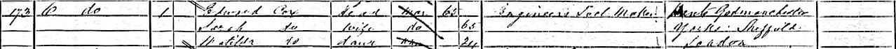 Edward Cox, declared his job as an “Engineer’s Toolmaker,” in the 1871 U.K. census, living at 6 Cranworth Road, Sheffield.