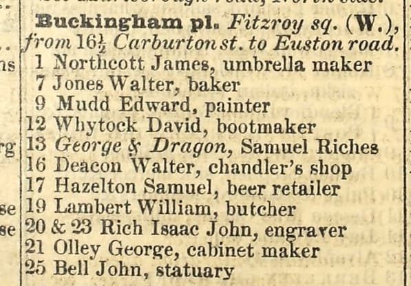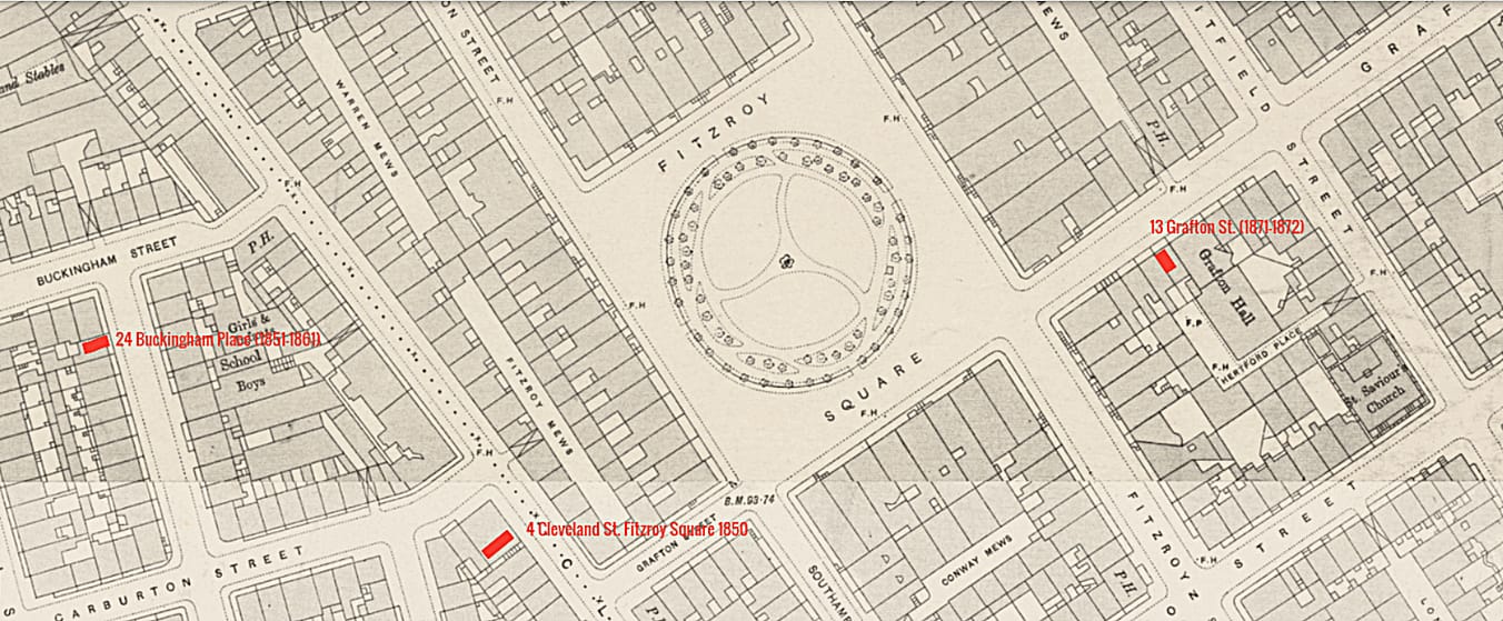 In the London street directory of 1850, Buckingham way was shown as starting opposite Keppel Row, then proceeding through a maze within that block, crossing Buckingham Street, and entering a small cul-de-sac, where George Kerr would have lived at no. 24. By 1860, the London street directory described a changed layout, starting from 16 1/2 Carburton St. with no. 1, and counting up going northward, to 25, ending at Euston Road. I have used the 1861 London Street Directory to determine Kerr’s address location in the excerpt of Fitzrovia from the 1894 Ordnance Survey, where the description showed more congruence with that period map. All told, either version placed George Kerr within the same block.