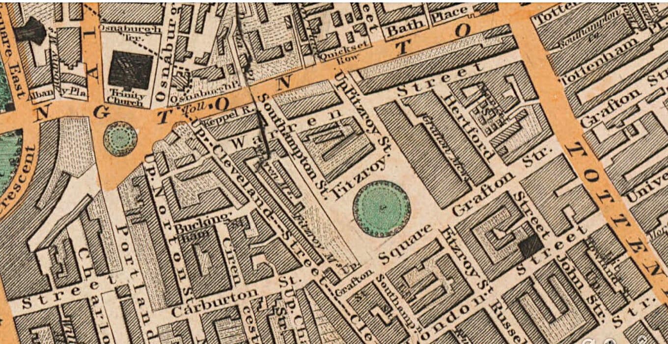 While George Kerr lived in St. George’s Parish earlier in his life, in the last 20 years of his life, he gravitated to the Fitzroy Square neighborhood. Even 1 Newman mews and 36 Store St. were within walking distance from Fitzroy Square.