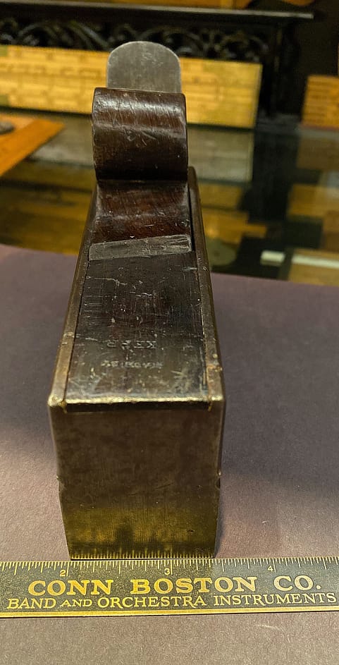 Measuring only 4-3/8″ long, 1-3/8″ wide and 1-1/4″ high, I would think that this plane would have possibly been made for an instrument maker of some kind. Certainly some of these types of planes, most notably Norris thumb planes, were marketed towards pianoforte case makers and the like. It stands to reason that this mitre plane could’ve been made for a similar purpose.