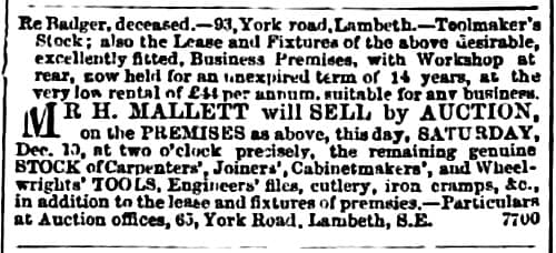 “Re: Badger, deceased 93 York Road Lambeth–Toolmaker’s Stock; also the lease and fixtures of the above desirable, excellently fitted. Business Premises, with workshop at the rear held for the expired term of 14 years at the annual rental of 44 GBP. Mr. Mallet will sell by auction on the premises as the above on the 10th the remaining genuine stock of Carpenters’ Joiners’, Cabinetmakers’, and Wheelwrights’, Tools, Engineer’s files, cutlery, iron cramps etc. in addition to the lease.” 10 December, 1870 London Chronicle.
