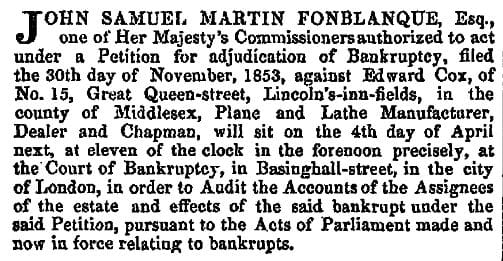 15 Great Queen St. was right around the corner from Ann Moon’s Tool Warehouse at 4 Little Queen St. Having been in the right place at the right time, Edward Cox may have been a supplier of mitre planes and other tools to the Moon tool warehouse. The loss of business from the closing of the Moon Tool Warehouse circa 1848, may have played a role in forcing the bankruptcy of Edward Cox in 1853.