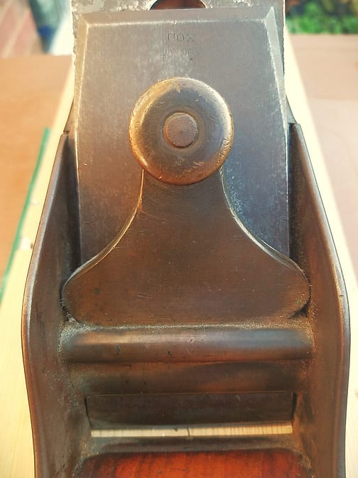 Cox smooth plane from Stanley Auction, August, 2024, lot no.915. Image of lever cap. Photo by David Stanley Auctions.