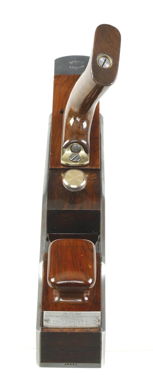 A silver plaque on the front of the plane is inscribed A.S.W. Apprentice Competition 1st Prize Bro. L.F.Gillett Stratford-on Avon 1941. The plane also exhibits two other features unique to previous Norris planes i.e. the combined handle and wedge is removed by loosening a brass knob, there is then the facility to adjust the handle laterally with a screw on the underside of the wedge. The handle can also be tilted by adjusting a screw at the base of the handle.