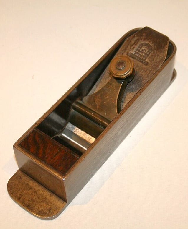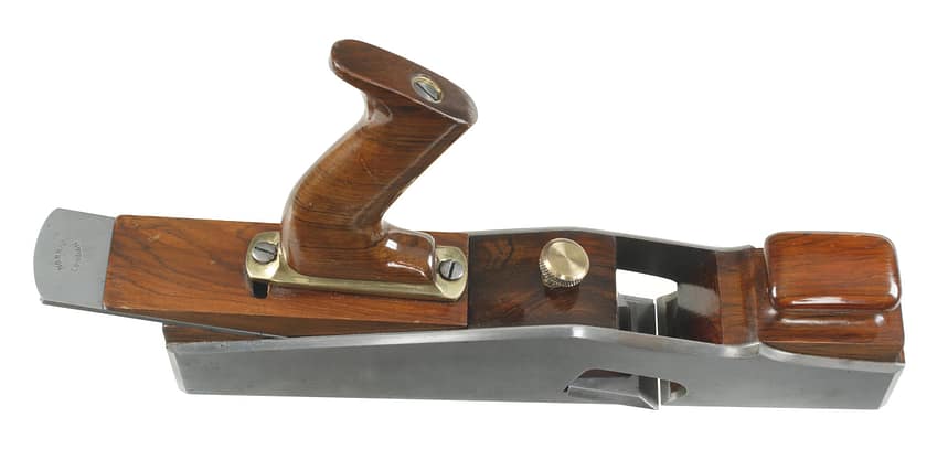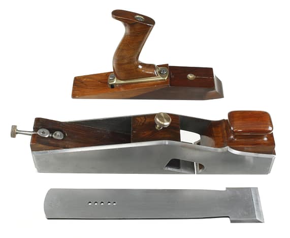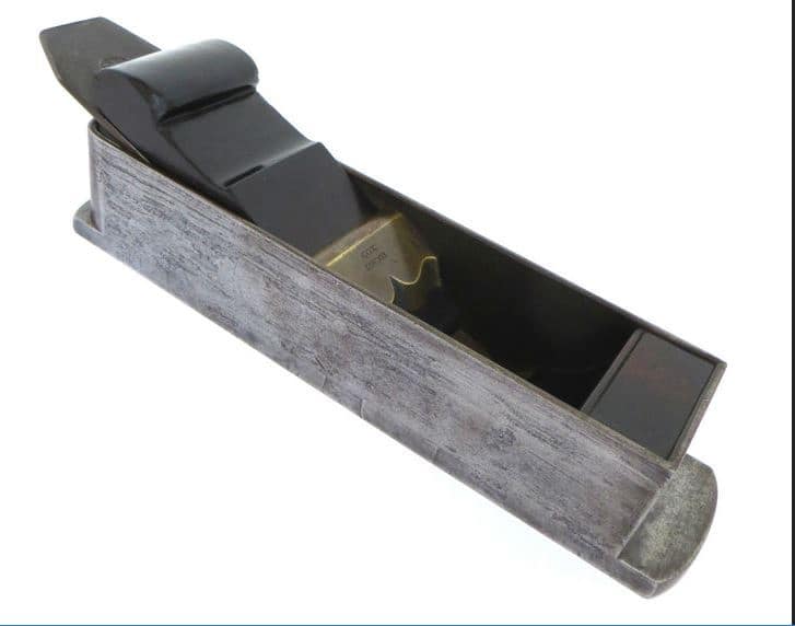 “A unique “Presentation” d/t steel mitre/rebate plane by NORRIS London measuring 13 1/2″ x 2 1/4″ with figured rosewood infill and adjustable handle, previously sold in Tony Murland’s 2006 auction Lot 496 with the following description (which would be difficult to improve on!):