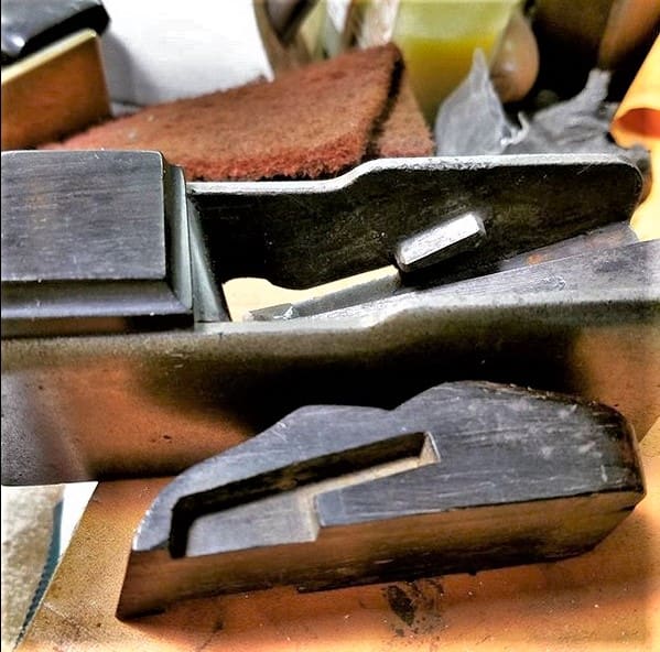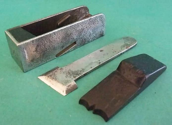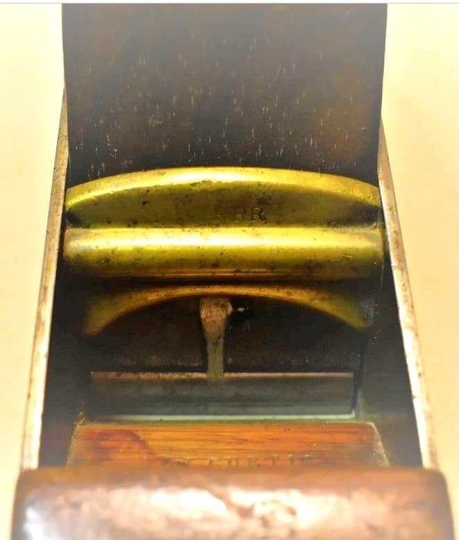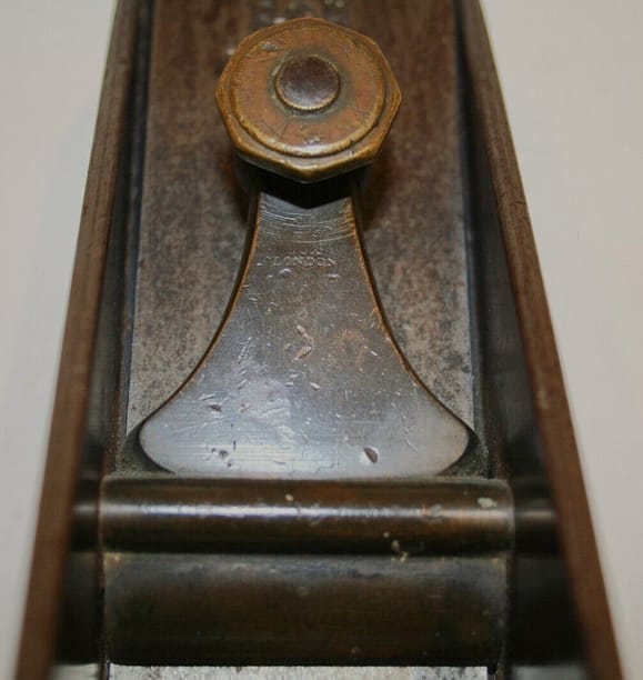 The rear face of the front infill has a typical “S” moulding that is often a characteristic of infill mitre planes. The metalwork has light all-over pitting but this is not deep. Supposedly the pictures make it look darker than it is.