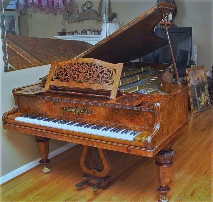 Collard & Collard piano; one of their facilities was located at 194-196 Tottenham Court Road, London at the time of researching for Tallis’ Street Views of London (1838-40). Pianos were previously called Clementi, for the former factory co-owner, famous pianist and composer, Muzio Clementi (1752-1832). Clementi sonatinas are still much used by piano teachers today.