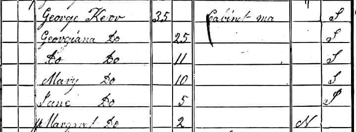 George Kerr, “Cabinet-Maker,” Kingsland Place, Aberdeen, Scotland in the 1827 P.O. Directory. These two documents are in chronological conflict, but they may both be for our George Kerr. The City/Trade Directory staff did not always do a great job keeping up with the moves of their inhabitants. This 1827 Aberdeen listing could have been a carry-over from 1825 or early 1826.