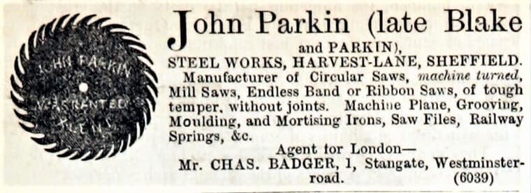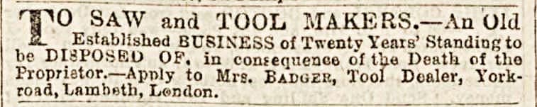 “To Saw and Tool Makers–An old established business of twenty years’ standing to be disposed of, in consequence of the Death of the Proprietor–apply Mrs.[Isabella] Badger York Road Lambeth London.” Sheffiel Daily Telegraph, 22 March, 1870.
