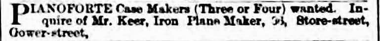 Planemaker George Kerr’s advertisement for additional labor at 36 Store St. (“Pianoforte Case Makers”) in the Clerkenwell News, September 1, 1865. Another possibility is that George Kerr wanted to lend some Piano Case Makers a new type of plane, in order to receive some feedback on the effectiveness of some new changes that he was experimenting with.