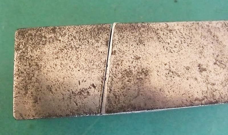 The wedged Kerr mitre plane has 3 long dovetails on each side: 1 dovetail in front of the mouth, and 2 dovetails behind the mouth. The sole is joined at the mouth with a modified butt joint that appears to have a small triangular shaped wedge driven in after assembly. Iron stock for the sidewalls is of normal thickness for the period, and the heel was bent in a single horseshoe bend. Flange extensions on the toe and heel are short, resulting in a plane 7 7/8″ long. And the sole is 2 1/4″ wide, with a 2″ iron.