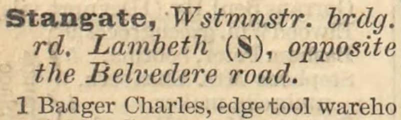 Charles Badger, “Edgetool Warehouse,” 1 Stangate St.,1868 London Street Directory. Last year for Badger at 1 Stangate, which was confirmed by the St. Thomas’ Hospital Archives.