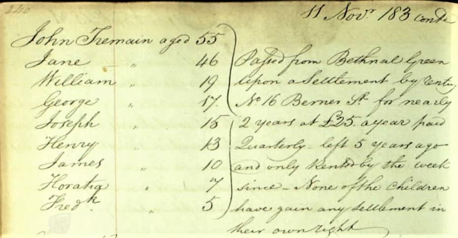 John Tremain Sr was a cabinetmaker, and almost all of his sons became cabinetmakers as well. Plying that trade did not necessarily shelter John and his family from hardship, however. The Tremains were recorded in the Bethnal Green Poor Law Removal and Settlement Records on 11 November, 1831: