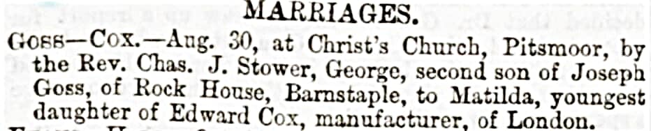 Cox and Goss wedding announcement, 17 October, 1873, Sheffield Daily Telegraph. At the end of his life, 20 years after leaving London, Cox still referred to himself as a “London tool manufacturer” in his daughter Matilda’s 1873 wedding announcement. Edward’s widow, Sarah, age 71, was buried next to him in Burngreave Cemetery (grave no. 3, sect. Y2), on 6 June, 1876.
