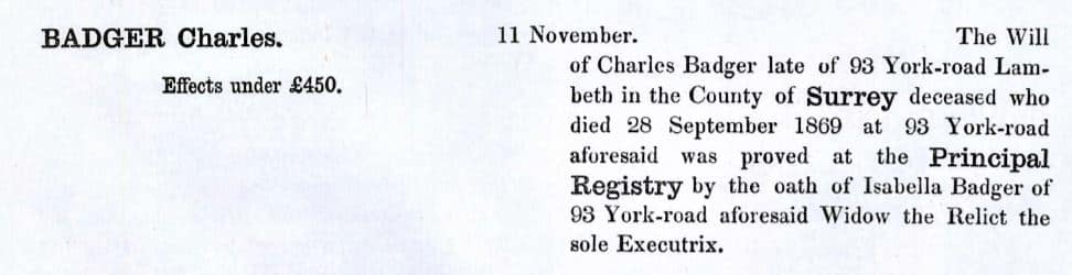 Charles Badger in the Probate Calendar. In just 16 months, Badger had spent down his £950 payout from the London Metropolitan Board of Works by £500 as well as other assets he may have had; moving his dealership and workshop must have been quite an expensive proposition.