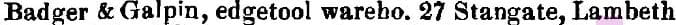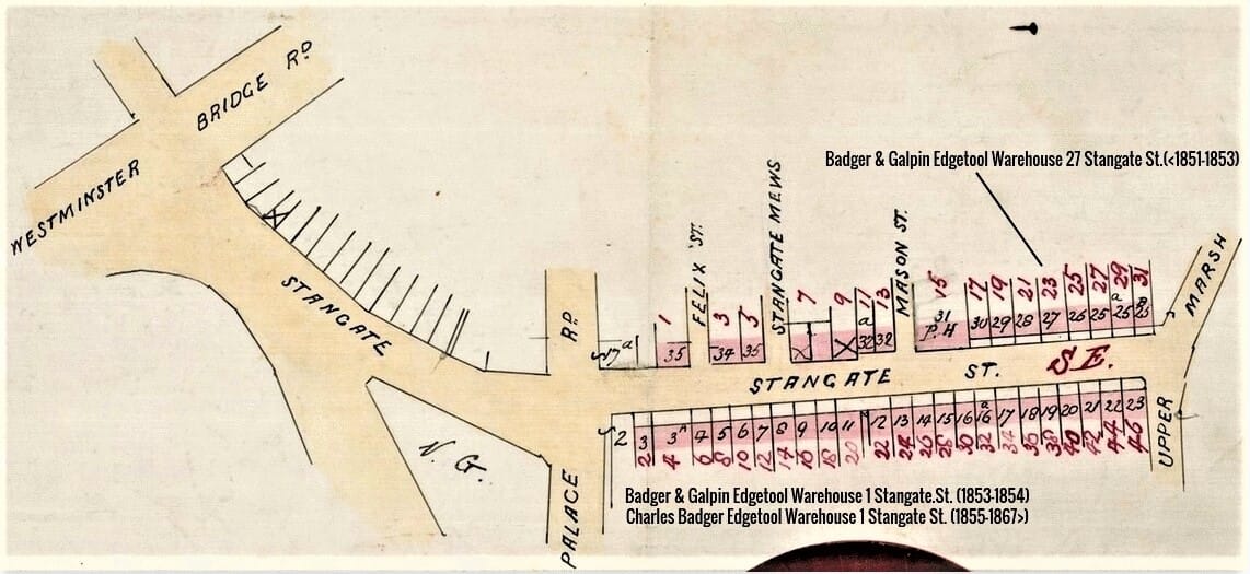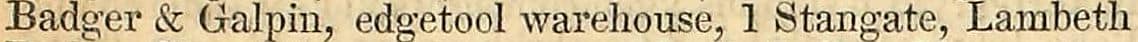 Badger & Galpin, “Edgetool Warehouswe,” 1 Stangate Street, Lambeth. 1854 London Post Office Directory. Badger & Galpin moved their shop to 1 Stangate St., sometime before the 1854 London P.O. Directory (“Badger & Galpin Edgetool Warehouse”) was published.