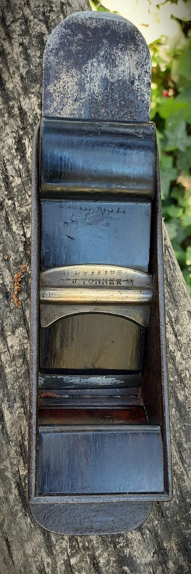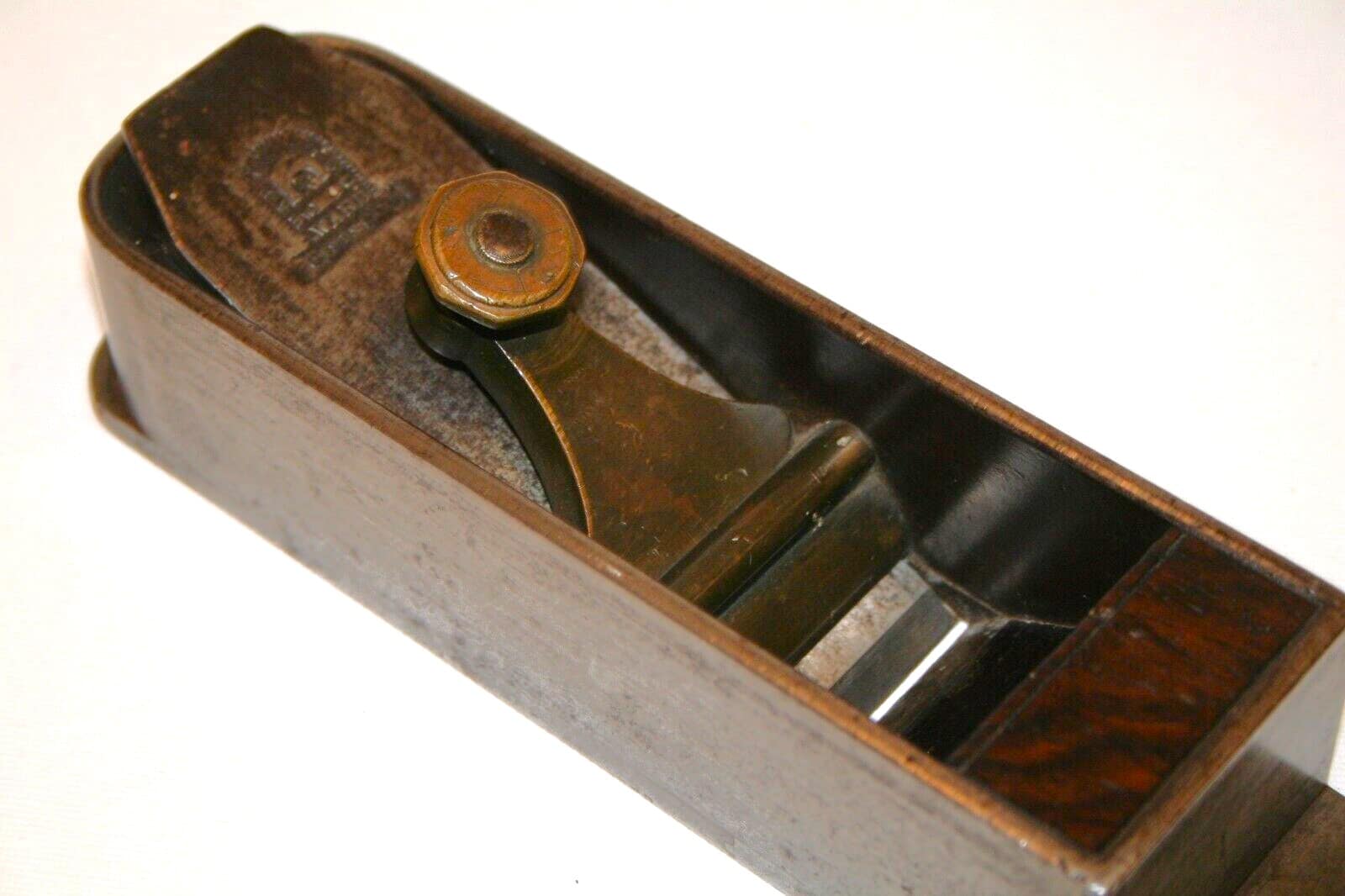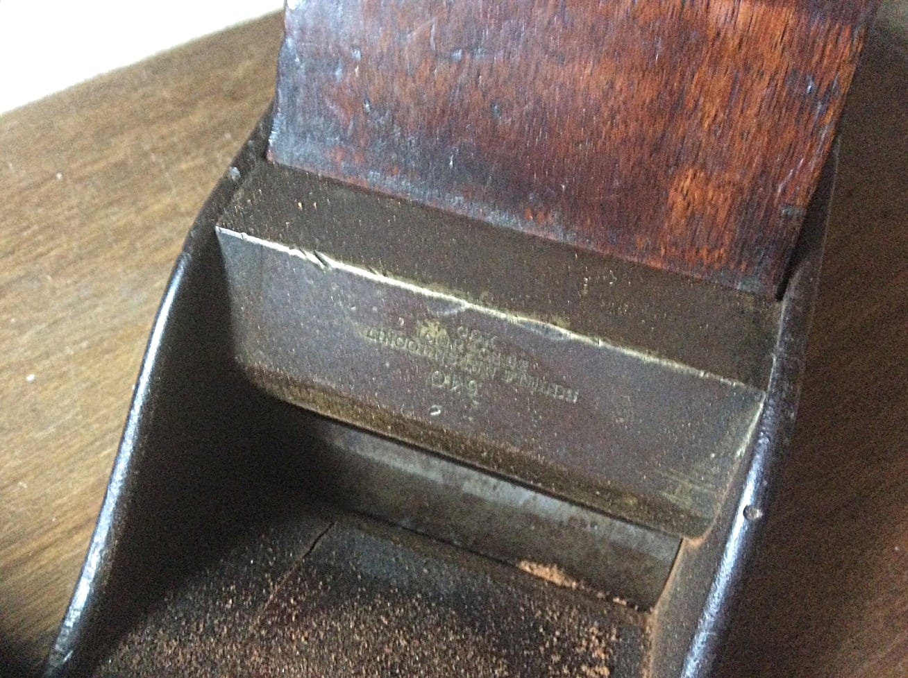 The rear face of the front infill has a typical “S” moulding that is often a characteristic of infill mitre planes. The metalwork has light all-over pitting but this is not deep. Supposedly the pictures make it look darker than it is.
