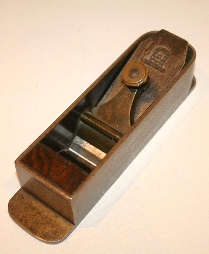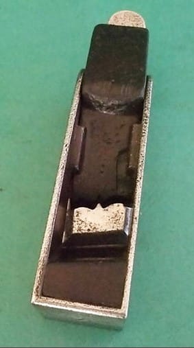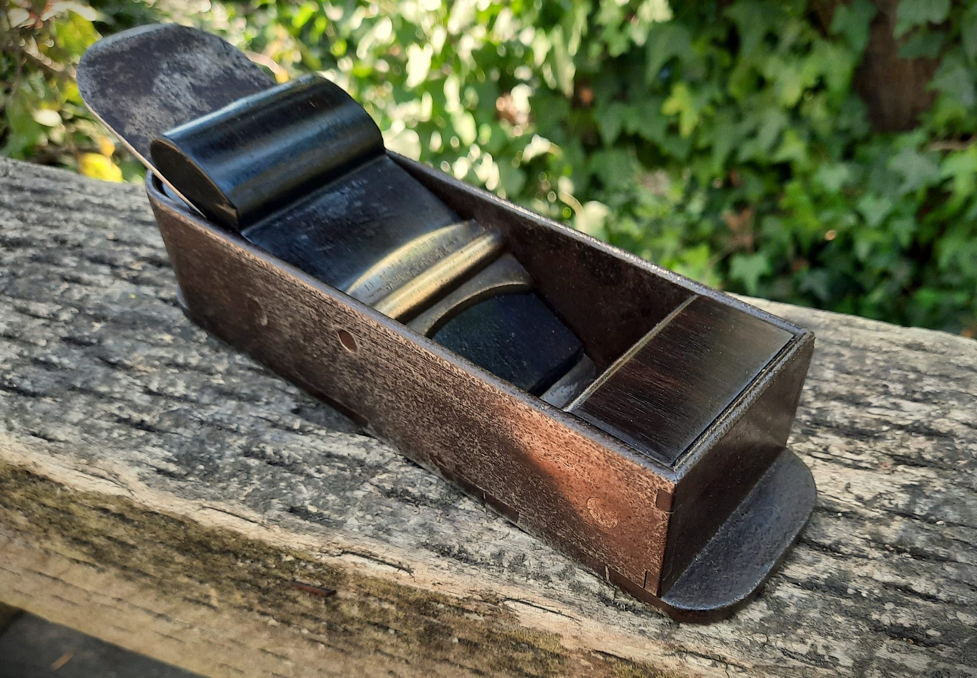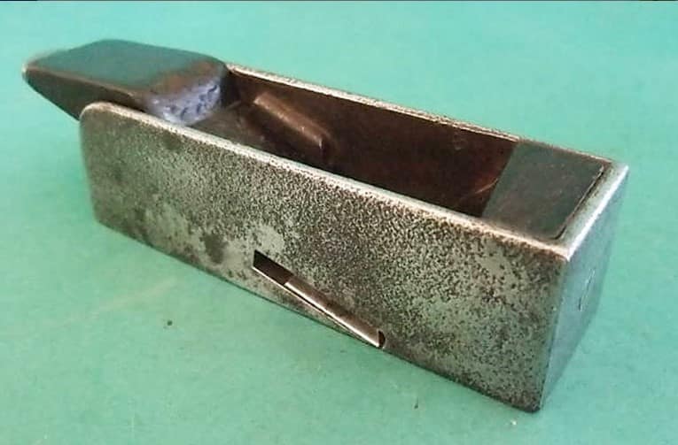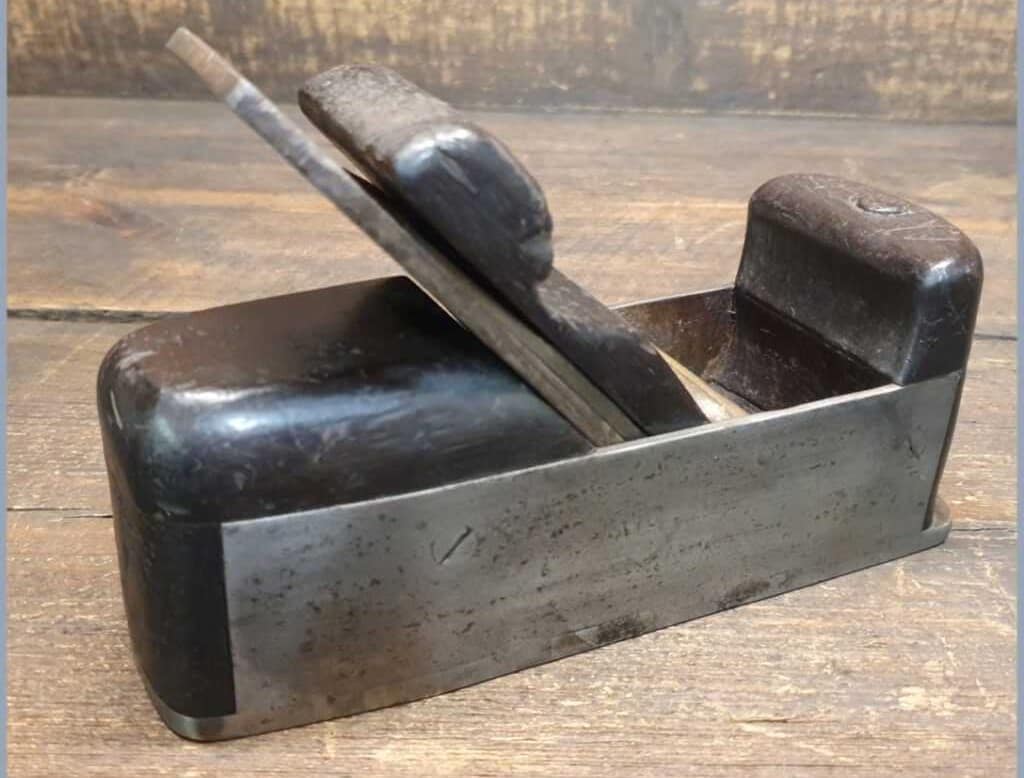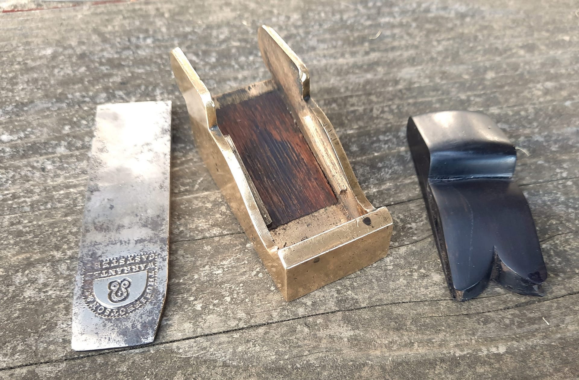 The rear face of the front infill has a typical “S” moulding that is often a characteristic of infill mitre planes. The metalwork has light all-over pitting but this is not deep. Supposedly the pictures make it look darker than it is.