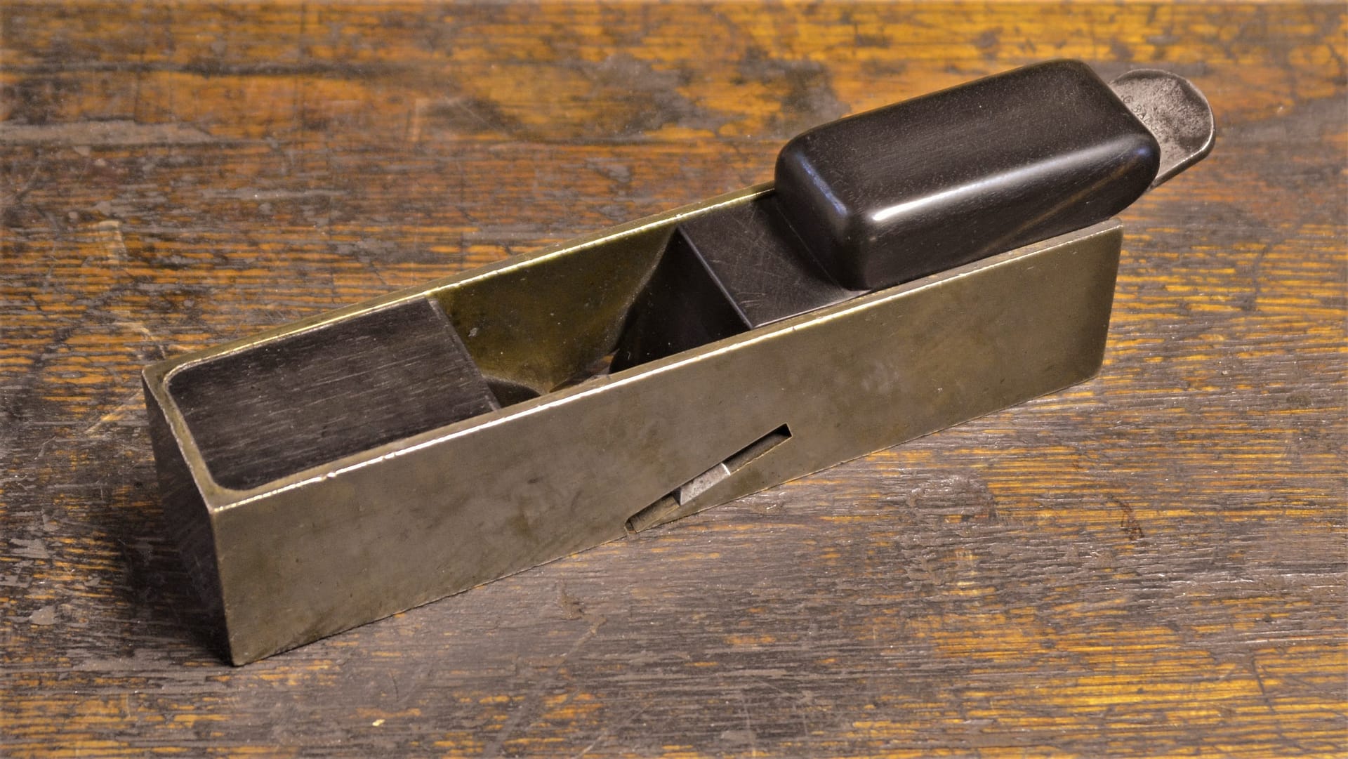 Badger Mitre Rebate plane, 8 3/4″ long, 1 7/8″ wide. Gunmetal with ebony infill. Badger is mostly known for his smaller planes, including bullnose, chariot, and specialist planes, such as his mitre rebate planes, but he did make a limited number of smooth planes and panel planes as well. Full sized example of the Badger Mitre Rebate plane. The Holland skewed Mitre Rebate shown after this one has an identical side escapement to the Badger Mitre Rebate shown here. Basically, it’s a slit with a gentle curve directly above the mouth.