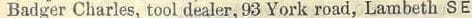 Charles Badger (1817-1869) lived with his wife Isabella at 1 Stangate St. in Lambeth, and reported his occupation as ” Master Tool Maker” for the UK census in 1861.