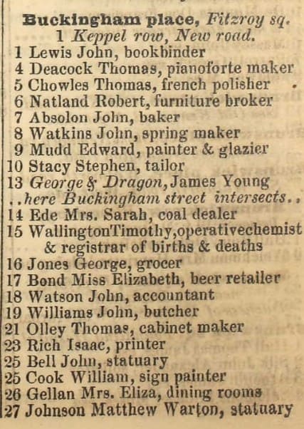 In the London street directory of 1850, Buckingham way was shown as starting opposite Keppel Row, then proceeding through a maze within that block, crossing Buckingham Street, and entering a small cul-de-sac, where George Kerr would have lived at no. 24. By 1860, the London street directory described a changed layout, starting from 16 1/2 Carburton St. with no. 1, and counting up going northward, to 25, ending at Euston Road. I have used the 1861 London Street Directory to determine Kerr’s address location in the excerpt of Fitzrovia from the 1894 Ordnance Survey, where the description showed more congruence with that period map. All told, either version placed George Kerr within the same block.