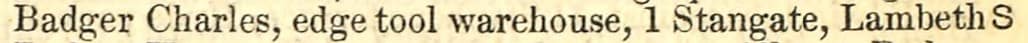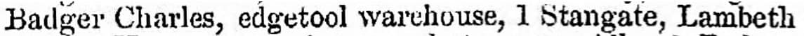 Charles Badger, “Edgetool Warehouse,” 1 Stangate St, Lambeth. 1856 London Trade Directory. Before 1855, John Galpin had left the partnership, and only Badger was listed at 1 Stangate, where he remained until his 1868 move to 93 York Road.
