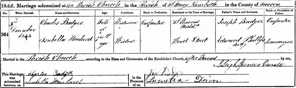 Charles Badger married Isabella Reulard at the Parish of St. Mary in Lambeth, 3 December, 1843. Isabella and Charles were a widow and widower respectively. Charles lived in St. Pancras previous to his 1843 marriage. Edward Phillips, Isabella’s father, was declared an “Ironmonger,” which proved to be an influential role for their future. I believe his example may have led Charles Badger to set business goals higher than that of a solitary self employed tool maker.