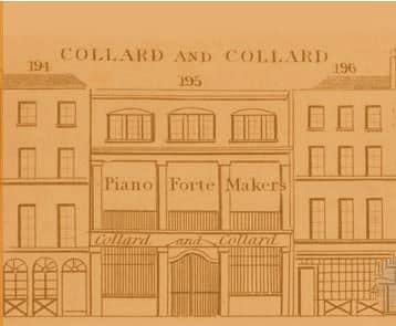 Collard & Collard piano; one of their facilities was located at 194-196 Tottenham Court Road, London at the time of researching for Tallis’ Street Views of London (1838-40). Pianos were previously called Clementi, for the former factory co-owner, famous pianist and composer, Muzio Clementi (1752-1832). Clementi sonatinas are still much used by piano teachers today.