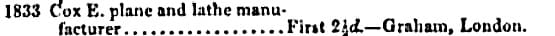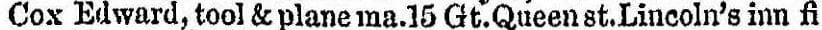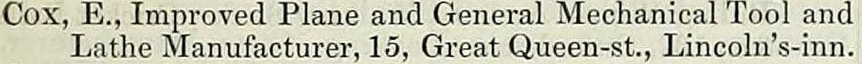 Edward Cox, Tool & Plane Maker, 1 Great Queen St. Lincoln’s Inn Fields, 1843 Robson’s London City Directory.
