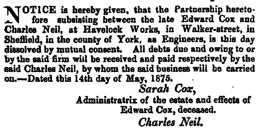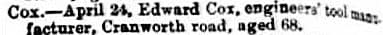 Cox and Goss wedding announcement, 17 October, 1873, Sheffield Daily Telegraph. At the end of his life, 20 years after leaving London, Cox still referred to himself as a “London tool manufacturer” in his daughter Matilda’s 1873 wedding announcement. Edward’s widow, Sarah, age 71, was buried next to him in Burngreave Cemetery (grave no. 3, sect. Y2), on 6 June, 1876.