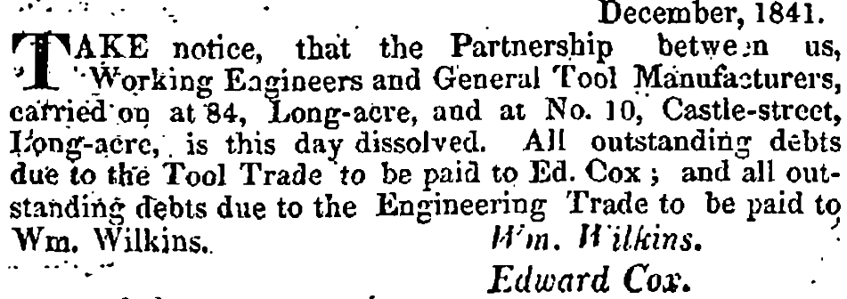 Dissolution of partnership between Edward Cox and William Wilkins, December 1842. London Gazette, Dec., 1842. Edward Cox and William Wilkins had a working partnership, which ended in December 1841. Unlike most all of the other British metal planemakers, Cox seemed comfortable with forming business partnerships with other specialists in the tool trade–outside of immediate family relationships (except Badger). It was unclear whether Wilkins was the sole engineer, and Cox was the general toolmaker,But Cox later made lathes, which would have required access to some serious foot-powered or steam powered metal working machine tools such as grinders, lathes, shapers, and planers. At this earlier point, he would have also gained some practical engineering experience from his working relationship with William Wilkins. But more likely, it was the proximity of the Holtzapffel factory, located at 127 Long-acre starting in 1828 (Cox was at 84 Long-Acre and 10 Castle St.): this early Holtzapffel facility would have been fabricating lathes at the time. As an inquisitive and ambitious young man, Edward Cox would have been very interested in the manufacturing process around lathe-making, and would have frequently visited the Holtzapffel factory to observe and learn.