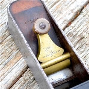 A silver plaque on the front of the plane is inscribed A.S.W. Apprentice Competition 1st Prize Bro. L.F.Gillett Stratford-on Avon 1941. The plane also exhibits two other features unique to previous Norris planes i.e. the combined handle and wedge is removed by loosening a brass knob, there is then the facility to adjust the handle laterally with a screw on the underside of the wedge. The handle can also be tilted by adjusting a screw at the base of the handle.
