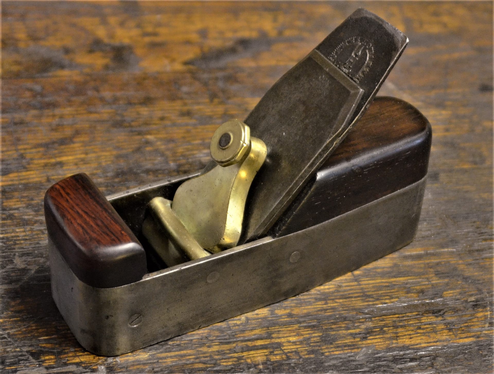 “A unique “Presentation” d/t steel mitre/rebate plane by NORRIS London measuring 13 1/2″ x 2 1/4″ with figured rosewood infill and adjustable handle, previously sold in Tony Murland’s 2006 auction Lot 496 with the following description (which would be difficult to improve on!):