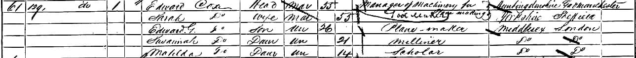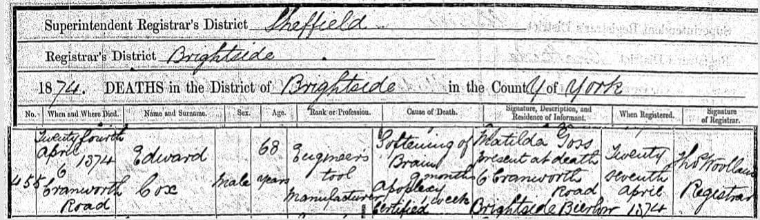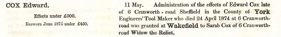 Edward Cox, declared his job as an “Engineer’s Toolmaker,” in the 1871 U.K. census, living at 6 Cranworth Road, Sheffield.