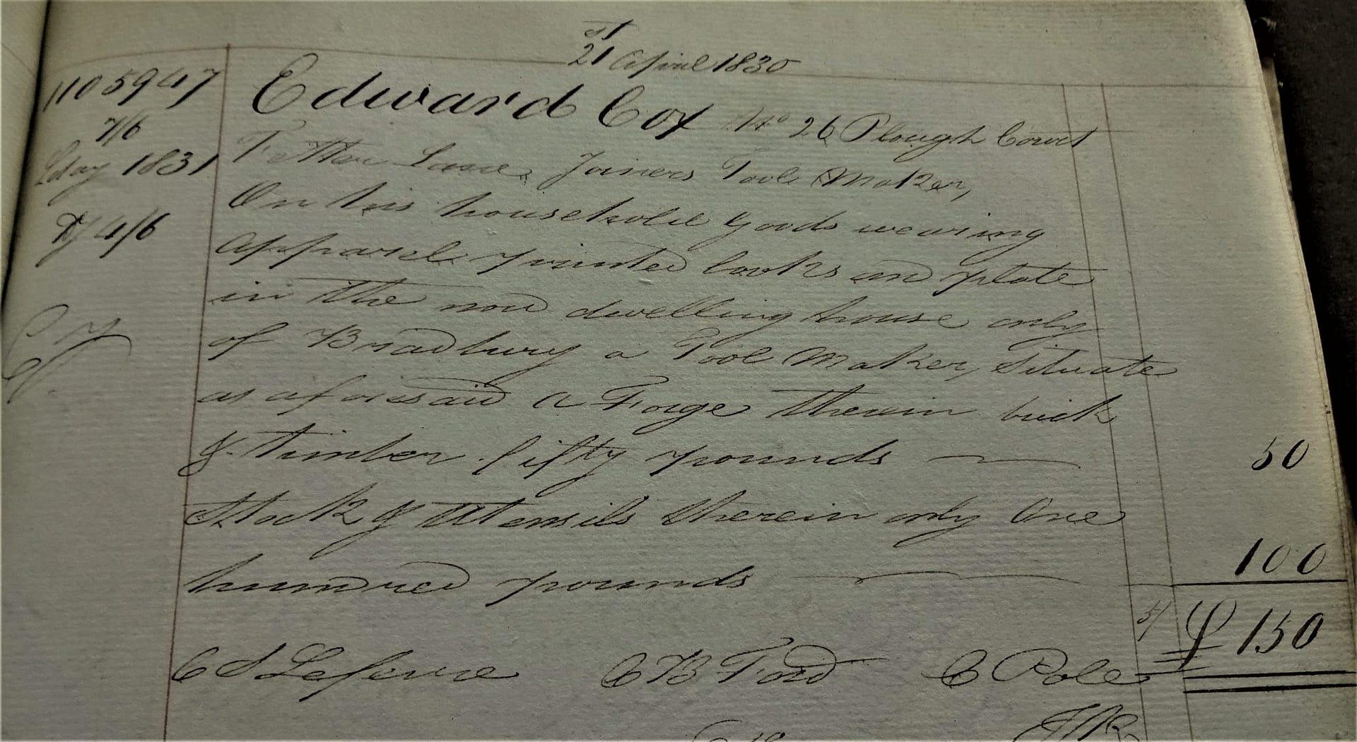 Edward Cox, Joiners’ Toolmaker at 26 Plough Court, Fetter Lane, <1830-1831>. By 1830, 24 year old Edward Cox had established himself as a Joiners’ Toolmaker at 26 Plough Place, Fetter Lane in London. Cox shared these premises with another toolmaker by the name of Bradbury, and they had a forge on site there. Plough Place was about 5 blocks east of Lincoln’s Inn Fields. “Utensils” denoted equipment and tools, not knives and spoons.