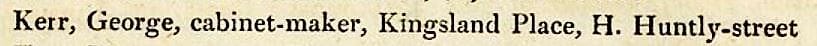 George Kerr, “Cabinet-Maker,” Kingsland Place, Aberdeen, Scotland in the 1827 P.O. Directory. These two documents are in chronological conflict, but they may both be for our George Kerr. The City/Trade Directory staff did not always do a great job keeping up with the moves of their inhabitants. This 1827 Aberdeen listing could have been a carry-over from 1825 or early 1826.