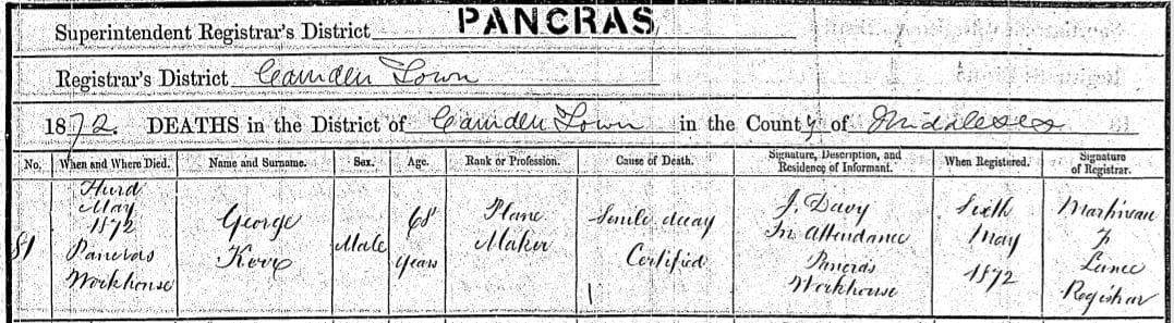 Death of Harriet Bulbeck Kerr, at the Saint John’s Road Workhouse in Islington, 19 November, 1893. Then, on 19 November, 1893, Harriet Kerr died in the Saint John’s Road Workhouse in Islington.