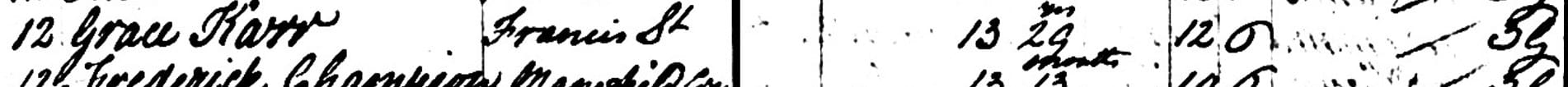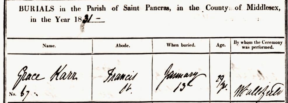 Grace Kerr, age 29, was buried on 13 January, 1831. Saint Pancras Parish Chapel. Grace and George lived on Francis Street in 1831. Upon his death, George Kerr would also be buried at the Saint Pancras Chapel cemetery in Camden.