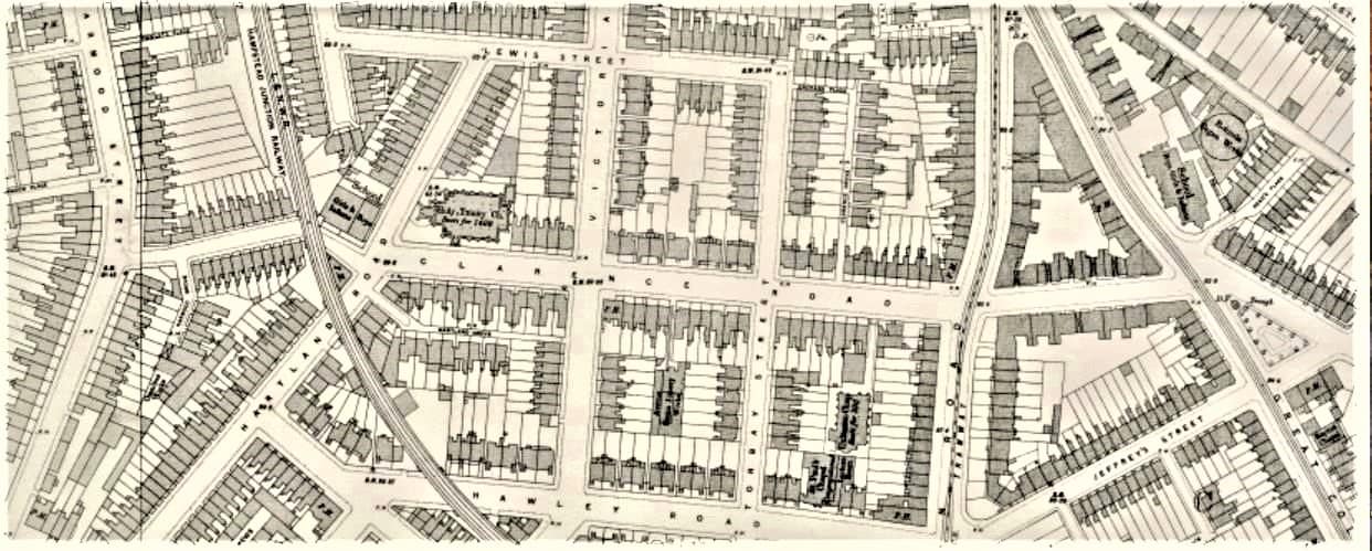 Oval Road, Kentish Town. 1893 London Ordnance Survey. Sometime before 1851, Edward, Sarah and Charlotte left Brighton, and moved to Kentish Town (Saint Pancras), London. John George made a career switch from planemaking to pianomaking and started work at Collard & Collard Piano Company.